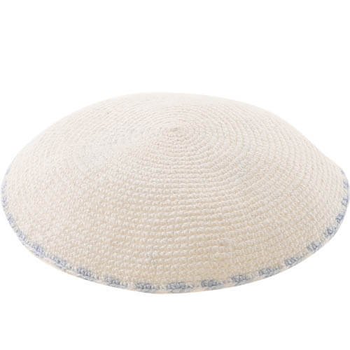 C Knitted DMC Kippah 13 Cm- White With Light Blue Around