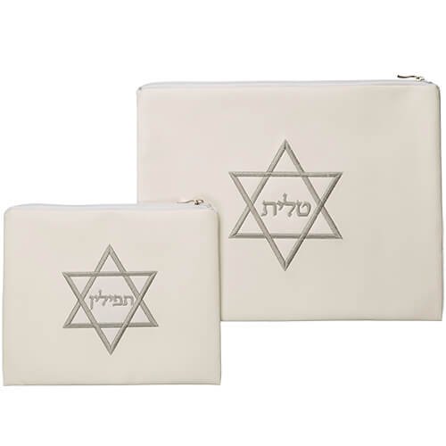סט טלית תפילין דמוי עור מהודר "מגן דוד" גוון כסף 30X37 ס"מ